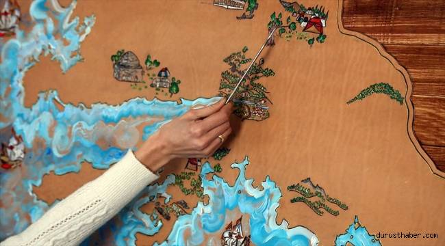 Usta öğretici Gülhasret Tunç, AA muhabirine, Kanuni Sultan Süleyman'ın Rodos seferinin 500. yıl dönümü dolayısıyla belge niteliğinde bir sanat eseri ortaya koyduklarını bildirerek, "Kanuni'nin sefer öncesi Muğla güzergahında ordusunun istirahat edebilmesi için otağını kurduğu alanlardan Rodos'a kadar kuşatmayı da içine alan bölümü fethin 500. yılında sanatsal bir çalışmayla günümüze taşımak istedik." dedi.Kanuni Sultan Süleyman'ın 1522 yılındaki Rodos seferinde Bozüyük'ten Marmaris'e buradan Rodos'a kadar kullandığı güzergahı birçok tekniği bir arada kullanarak çalıştıklarını belirten Tunç, güzergahları olması gereken konumlarda deri ve ahşapla buluşturduklarını kaydetti.Tunç, Kanuni'nin Muğla güzergahında otağını kurduğu alandan Rodos'a kadar kuşatmayı da içine alan bölümü aktarmaya çalıştıklarını dile getirerek, "Bu çalışma Muğla'nın kültürel değerini artırmak ve korumak için yaptığımız önemli bir tasarım. Bundan sonra binlerce yıl birçok medeniyete hizmet eden ve bu topraklarda ortaya çıkan tarihi yapıları deri ve ahşaba işleyeceğiz." ifadelerini kullandı.Ressam ve eğitmen Nilgün Karatopraklı ise Kanuni'nin Rodos seferi güzergahını resim sanatında kullanılan tekniklerle hazırladıklarını kaydetti.Çalışmanın hem bir tasarım hem de bütün alanların orijinal yerlerinde gösterilmesi nedeniyle bir belge niteliğinde olduğunu dile getiren Karatopraklı, bu kapsamda kente önemli bir eser kazandırdıklarını ifade etti.Titiz çalışmanın başarıyı getirdiğini belirten Karatopraklı, şöyle konuştu:"Ahşap üzerine orijinal hayvan derisi oyularak güzergah işlendi. Bütün çizimler, deriler bıçakla oyulup, suyla ıslatılarak kesilen yerlerde oyuklar açıldı. Ayakkabı boyasıyla doldurulan bu noktalarda yanık etkisi bırakıldı. Bu çalışma bittikten sonra tasarımın boyama aşaması başladı. Önce deri boyaması yapıldı. Deniz kısmı boyamasında özel teknikler kullanılarak deriye bal mumu sürüp akrilik yapıldı. Ahşap deriyle olan görselin birleştirilmesi için özel bir boyama yapıldı. Kara için daha koyu, deniz için daha hafif bir renk kullandım."İki öğretmenini de tebrik ettiğini dile getiren Muğla Olgunlaşma Enstitüsü Müdürü Mehmet Keleş de projeye destek veren Muğla Sıtkı Koçman Üniversitesi akademisyenlerine teşekkür etti.