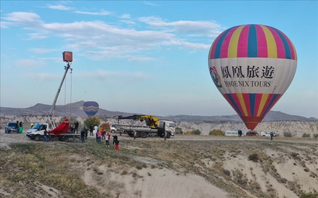 Türkiye'nin masalsı güzelliklerle bezeli turizm bölgesi Kapadokya'da, sıcak hava balonlarının renk kattığı manzarada fotoğraf çektirmek isteyenler için vinçlerle salıncak kuruluyor.