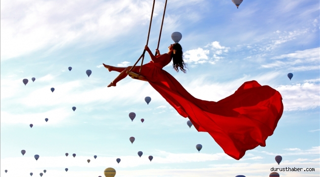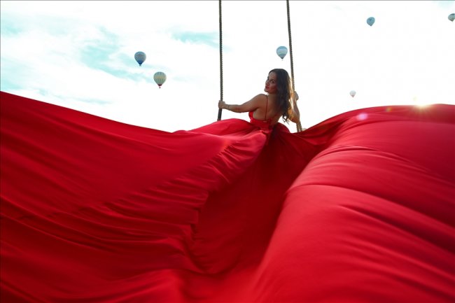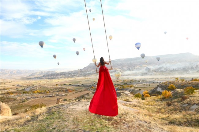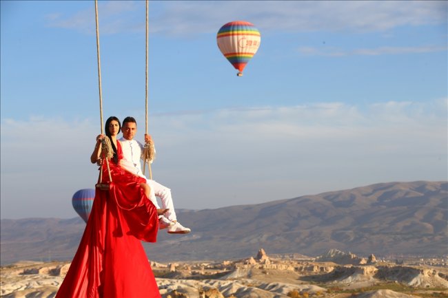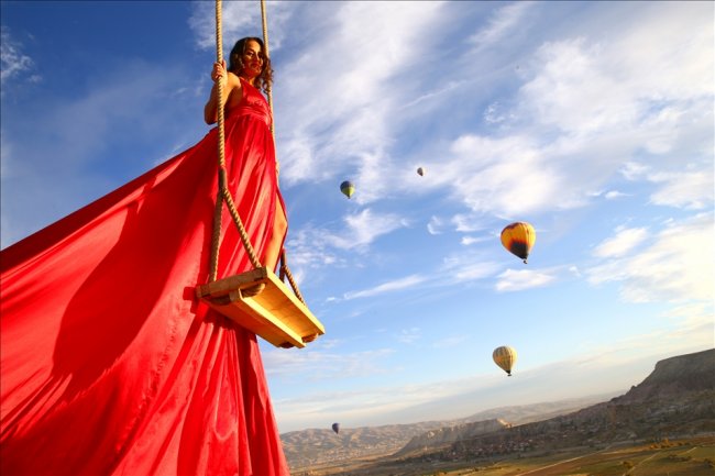 Son dönemde Kapadokya'da yaygınlaşan akımda, turistler ve düğün fotoğrafı çektirmek isteyenler, vinçlerle sarkıtılan salıncakta sıcak hava balonlarının oluşturduğu doğal dekorda anı ölümsüzleştiriyor.