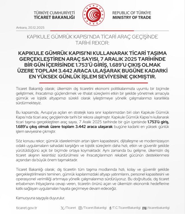 Türkiye’nin Avrupa’ya açılan en önemli sınır kapılarından biri olan Kapıkule Gümrük Kapısı, ticari araç geçişlerinde dikkat çekici bir başarıya imza attı. 7 Aralık 2025 tarihinde kaydedilen yoğunluk, bugüne kadar ulaşılan en yüksek günlük işlem rakamı olarak kayıtlara geçti.Söz konusu tarihte Kapıkule’den 1.753 ticari araç Türkiye’ye giriş yaparken, 1.689 araç çıkış gerçekleştirdi. Böylece toplam 3.442 ticari araç, yalnızca bir gün içinde gümrük işlemlerinden geçti. Bu rakam, sınır kapısının operasyonel kapasitesindeki artışı ve süreçlerin daha etkin yönetildiğini ortaya koydu.Uzmanlara göre bu rekor, son yıllarda hayata geçirilen dijitalleşme adımları, altyapı yatırımları ve personel kapasitesindeki güçlendirme çalışmalarının sahadaki somut karşılığı olarak değerlendiriliyor. İşlem sürelerinin kısalması ve lojistik akışın hızlanması, özellikle ihracatçılar açısından önemli bir avantaj sağlıyor.Yetkililer, Kapıkule’de ulaşılan bu seviyenin yalnızca bir sayıdan ibaret olmadığını; Türkiye’nin dış ticaretinin kesintisiz şekilde sürdürülmesi ve Avrupa hattındaki ticari hareketliliğin güçlenmesi açısından stratejik bir gösterge olduğunu vurguluyor.