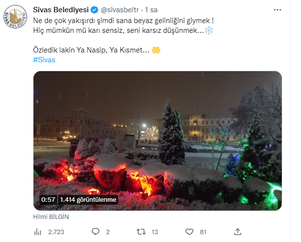 Paylaşımda, şehir merkezinin önceki yıllarda çekilen karlı görüntülerine, Neşet Ertaş'ın "Neredesin Sen" türküsü eşliğinde yer verildi.