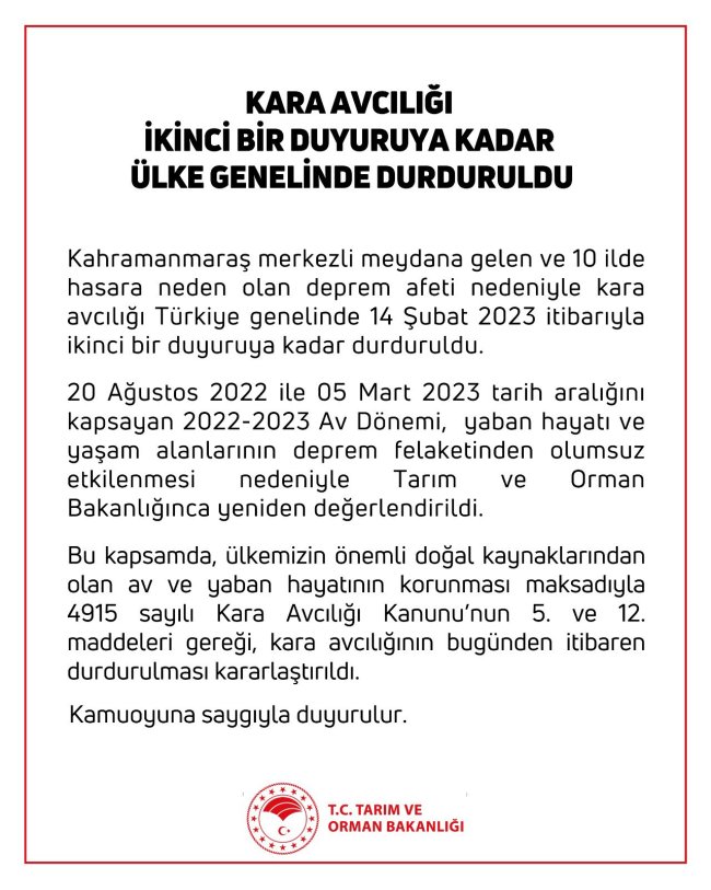 Tarım ve Orman Bakanlığı tarafından yapılan açıklamada, “Deprem felaketinden olumsuz etkilenen yaban hayatı ve yaşam alanlarının korunması amacıyla, kara avcılığı ikinci bir duyuruya kadar ülke genelinde durdurulmuştur” denildi.