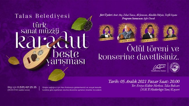 “KÜLTÜR VE SANAT YÖNÜNDEN BÜYÜK BİR KAZANIM”Talas Belediye Başkanı Mustafa Yalçın konuyla ilgili olarak yaptığı değerlendirmede çok önemli bir kültür sanat olayına imza attıklarına dikkat çekerek, “Talas ve Kayseri için kültür sanat yönünden büyük bir kazanım olan ‘Karadut TSM Beste Yarışması’nda süreç adım adım ilerliyor. Dereceye giren eserlerin açıklanmasının ardından şimdi de sıra o eserlerin kamuoyu ile paylaşılmasına geldi. 5 Aralık Pazar günü düzenleyeceğimiz konser ile hem dereceye giren şarkıları hem de diğer eserleri hep birlikte dinleyeceğiz” dedi.İLGİ BÜYÜK OLDUKayseri’nin ve Talas’ın güzelliklerini müzik yoluyla duyurmak ve yeni bestecilerin nitelikli eserlerle yetişmesini sağlamak amacıyla düzenlenen beste yarışmasına ilgi büyük oldu. Yurt çapından 72 eserin katıldığı yarışmada 12 besteye ödül verildi.Bahadır Sevik’in “Talas’ı Seveceksin” isimli bestesiyle birinciliği elde ettiği yarışmada Osman Ergen “Kayseri Nicedir” ile ikinciliği, Burhan Atik de “Kayserim Dağlarıyla Yaylalarıyla” üçüncülüğü elde etti. Yarışmada 9 da mansiyon ödülü verildi.GÜÇLÜ JÜRİ SES GETİRDİYarışma jürisinin ülkemiz musiki dünyasının önde gelen isimlerinden oluşması da ayrıca takdir gördü. Zekai Tunca, Amir Ateş, Ali Şenozan, Alaeddin Pakyüz ve Tevfik Soyata gibi isimlerin jüride yer alması dikkatlerden kaçmazken yarışma sonuçlarına duyulan güvenin, jürinin bu denli güçlü olmasından kaynaklandığı şeklinde yorumlandı.