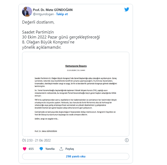 Saadet Partisi 8. Olağan Büyük Kongresi'nde genel başkan adayı olacağını açıklayan Prof. Dr. Mete Gündoğan, sosyal medya hesabından "iç çekişmeler"e sebep olmamak adına adaylıktan çekildiğini duyurdu.Saadet Partisi'nin 30 Ekim Pazar günü yapacağı 8. Olağan Büyük Kongresi'nde genel başkan adayı olacağını açıklayan Prof. Dr. Mete Gündoğan, bu kararını geri çektiğini duyurdu.Gündoğan, partinin Yüksek İstişare Kurulu'nda (YİK) Genel Başkan Karamollaoğlu üzerinde ittifak edilmesinin ardından "iç çekişmeler"e neden olmamak için bu kararı aldığını açıkladı.