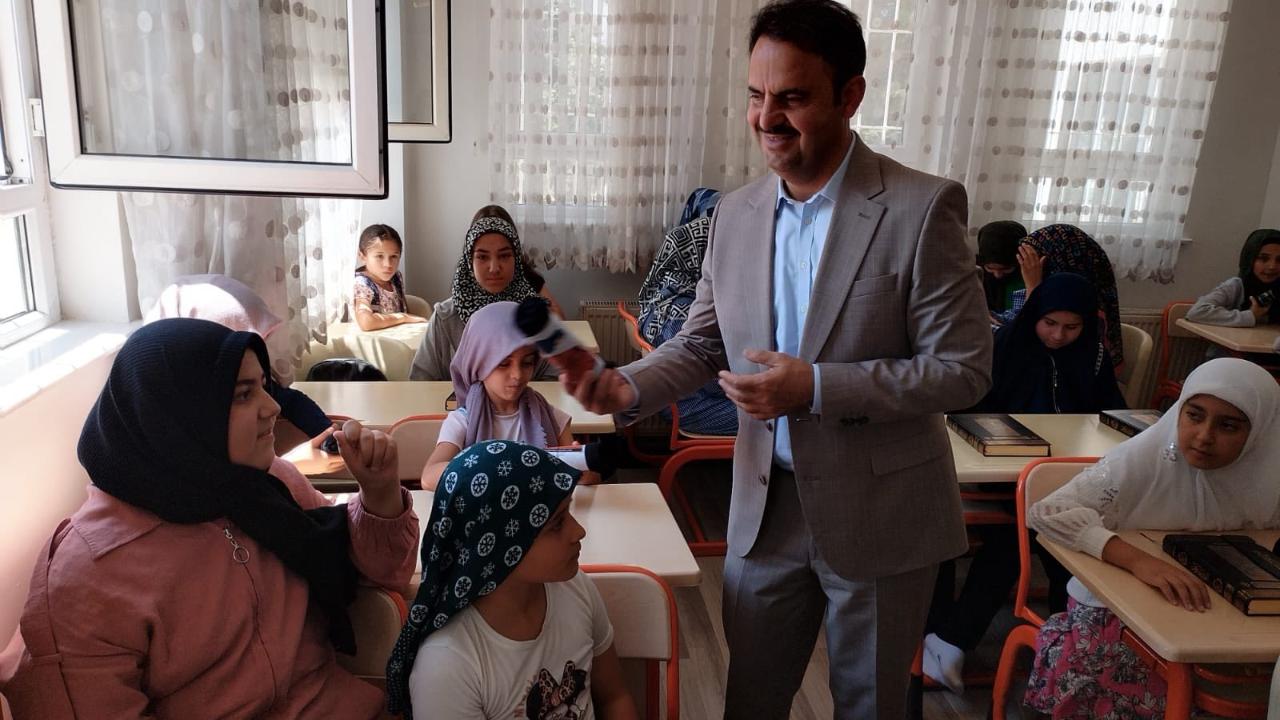 Sınıfları tek tek gezen Kaymakam Ermiş ve Müftü Uzun, öğrencilerle sohbet etti. Kocasinan Müftülüğü ve Türkiye Diyanet Vakfı Kocasinan Kadın Kolları tarafından düzenlenen program kapsamında, kız öğrencilere başörtüsü, erkek öğrencilere ise takke hediye edildi.