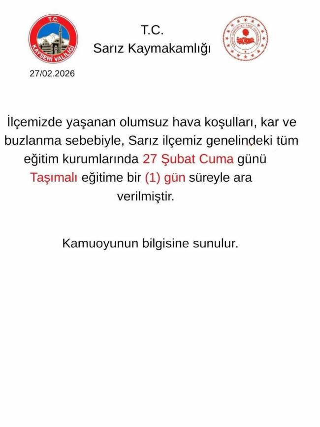 Sarız Kaymakamlığı’ndan yapılan yazılı açıklamada, ilçede yaşanan kar yağışı ve buzlanmanın eğitimi olumsuz etkilediği belirtilerek, “İlçemizde yaşanan olumsuz hava koşulları, kar ve buzlanma sebebiyle Sarız ilçemiz genelindeki tüm eğitim kurumlarında 27 Şubat Cuma günü taşımalı eğitime 1 gün ara verilmiştir” ifadelerine yer verildi.