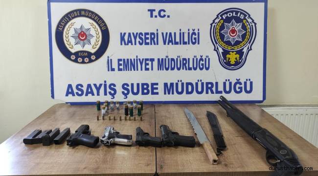 Kayseri İl Emniyet Müdürlüğü Asayiş Şube Müdürlüğü Hırsızlık ve Yankesicilik Büro Amirliği ekipleri kentte huzur ve güvenliği saplamak amacıyla çalışmalara devam ediyor. Bu kapsamda çeşitli tarihlerde meydana gelen hırsızlık olaylarının aydınlatılabilmesi ve faillerinin tespit edilerek yakalanabilmesi için 11 ikamet ve 2 depo olarak kullanılan yerde 40 ekip 90 polisin katılımı ile eş zamanlı operasyon düzenlendi. Yapılan aramada, 1 adet ruhsatsız tüfek, 4 adet tabanca (2 adet kurusıkı 2 adet gerçek), 2 adet pala, 72 adet çalıntı olduğu değerlendirilen matkap, hilti, spiral, televizyon vb. eşyaya el konuldu.