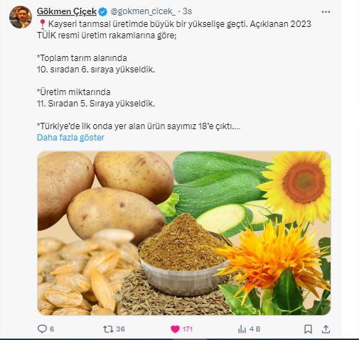 Kayseri Valisi Gökmen Çiçek sosyal medya hesabından paylaşımda bulunarak, “Kayseri tarımsal üretimde büyük bir yükselişe geçti. Açıklanan 2023 TÜİK resmi üretim rakamlarına göre; Toplam tarım alanında 10. sıradan 6. sıraya yükseldik. Üretim miktarında 11. Sıradan 5. Sıraya yükseldik” dedi. Kayseri, Türkiye'de en çok üretimi yapılan tarımsal ürünlerin yetiştirilmesinde ilk ondaki ürün sayısını 18'e yükseltti.