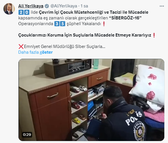 İçişleri Bakanı Ali Yerlikaya, para karşılığı çocukların müstehcen fotoğraflarını satan şahıslara 20 ilde Sibergöz-16 operasyonu başlatıldığını açıkladı.Bu operasyon kapsamında tam olarak 35 şüpheli yakalandı."Çocuklarımızı korumaya kararlıyız"İşte operasyon detayları;Çocuklarımızı koruma için suçlarla mücadele etmeye kararlıyız.