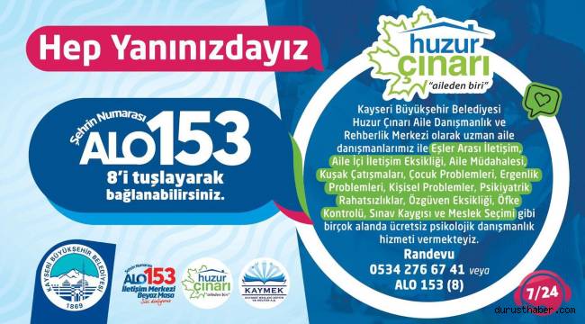 Belediyeden yapılan yazılı açıklamaya göre, Huzur Çınarı Aile Danışmanlık ve Rehberlik Merkezi yeni bir projeyi daha hayata geçirdi.Psikolojik danışmanlık hizmetinden yararlanmak isteyen vatandaşlar, Alo 153 Çağrı Merkezi'ni arayıp uzman aile danışmanlarından ücretsiz psikolojik danışmanlık hizmetinden faydalanacak.Vatandaşlar, uzman aile danışmanlarından eşler arası iletişim, aile içi iletişim eksikliği, aile müdahalesi, kuşak çatışmaları, çocuk problemleri, ergenlik problemleri, kişisel problemler, psikiyatrik rahatsızlıklar, özgüven eksikliği, öfke kontrolü, sınav kaygısı ve meslek seçimi gibi 12 farklı alanda ücretsiz psikolojik danışmanlık hizmeti alabilecek.