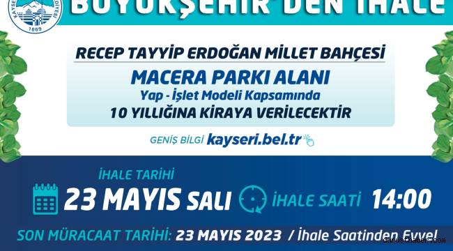 Kayseri Büyükşehir Belediyesi tarafından, Recep Tayyip Erdoğan Millet Bahçesi içerisinde bulunan taşınmaz, üzerine Yap- İşlet modeli kapsamında Macera Parkı Alanı tesis edilmek üzere, 2886 Sayılı Devlet İhale Kanunun 37. maddesi gereğince, “Kapalı Teklif Usulü” ihale ile 10 yıllığına kiraya verilecek.23 Mayıs 2023 Salı günü saat 14.00’te Büyükşehir Belediyesi Encümen Salonu’nda gerçekleştirilecek ihaleye müracaatlar, gerekli evraklar ile Büyükşehir Belediyesi Encümen Başkanlığı’nın (İhale Komisyonu) sekretarya görevini yapan Kararlar Şube Müdürlüğü kalemine yapılırken, son başvuru ise ihale saatinden evvel olarak belirlendi.Detaylı Bilgi için tıklayınız..