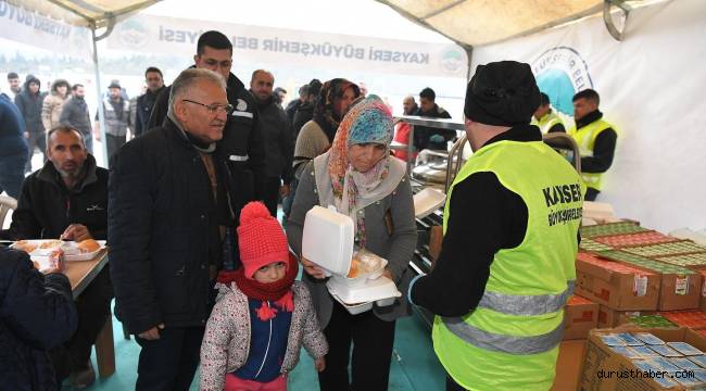 Konteyner kentte depremzede vatandaşlara Kayseri Büyükşehir Belediyesi ekiplerince sıcak yemek imkânı sunulurken, Başkan Büyükkılıç da hem depremzede vatandaşlara hem de görevli personele yemek dağıtımına eşlik etti.
