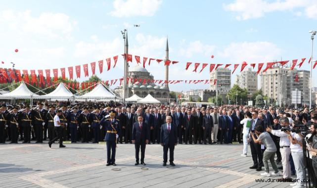 Vali Gökmen Çiçek, Garnizon Komutanı ve Başkan Memduh Büyükkılıç’ın yanı sıra; Cumhuriyet Başsavcısı, İl Emniyet Müdürü, İl Jandarma Komutanı, kamu kurum ve kuruluş temsilcileri, siyasi parti temsilcileri, gaziler, öğrenciler ve çok sayıda vatandaşın katıldığı törende, birlik ve beraberlik mesajları verildi.