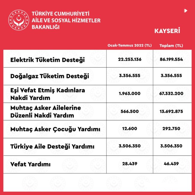 Aile ve Sosyal Hizmetler Bakanlığı tarafından Kayseri’de yapılan nakdi yardım miktarları açıklandı. Ocak – Temmuz 2022 tarihini kapsayan 7 ayda, ihtiyaç sahibi hane halkına 7 farklı kalemde destek yardımında bulunuldu.