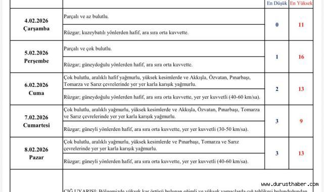 6 Şubat Cuma günü çok bulutlu ve aralıklı hafif yağmurlu, yüksek kesimler ile Akkışla, Özvatan, Pınarbaşı, Tomarza ve Sarız çevrelerinde karla karışık yağmur görülecek. Günün en düşük sıcaklığı 2, en yüksek sıcaklığı 13 derece olacak.