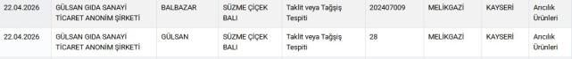 Bakanlık tarafından yayımlanan listede, Gülsan Gıda Sanayi Ticaret Anonim Şirketi’ne ait iki farklı ürün yer aldı. Denetimlerde firmanın “Balbazar” markalı süzme çiçek balı ile yine “Gülsan” markası altında üretilen süzme çiçek balı ürünlerinde taklit ve tağşiş yapıldığı belirlendi.