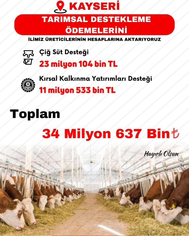 Yapılan açıklamaya göre, destekleme tutarının 23 milyon 104 bin lirası Çiğ Süt Desteği kapsamında, 11 milyon 533 bin lirası ise Kırsal Kalkınma Yatırımları Desteği çerçevesinde ödenecek.