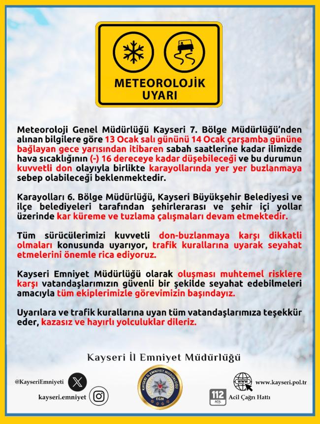 Kayseri İl Emniyet Müdürlüğü, Meteoroloji 7. Bölge Müdürlüğü’nün yaptığı buzlanma ve don uyarısı sonrası sürücüleri dikkatli olmaları konusunda uyardı.