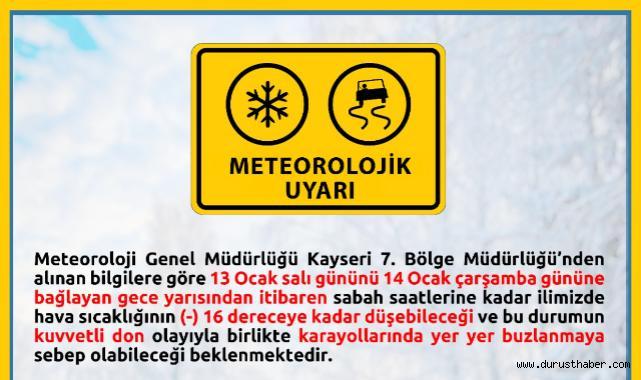 Meteoroloji 7. Bölge Müdürlüğü’nden alınan bilgilere göre, 13 Ocak Salı gününü 14 Ocak Çarşamba gününe bağlayan gece yarısından sabah saatlerine kadar Kayseri’de sıcaklıkların -16 dereceye kadar düşmesi bekleniyor. Bu durumun kuvvetli don ve karayollarında yer yer buzlanmaya sebep olabileceği belirtiliyor.
