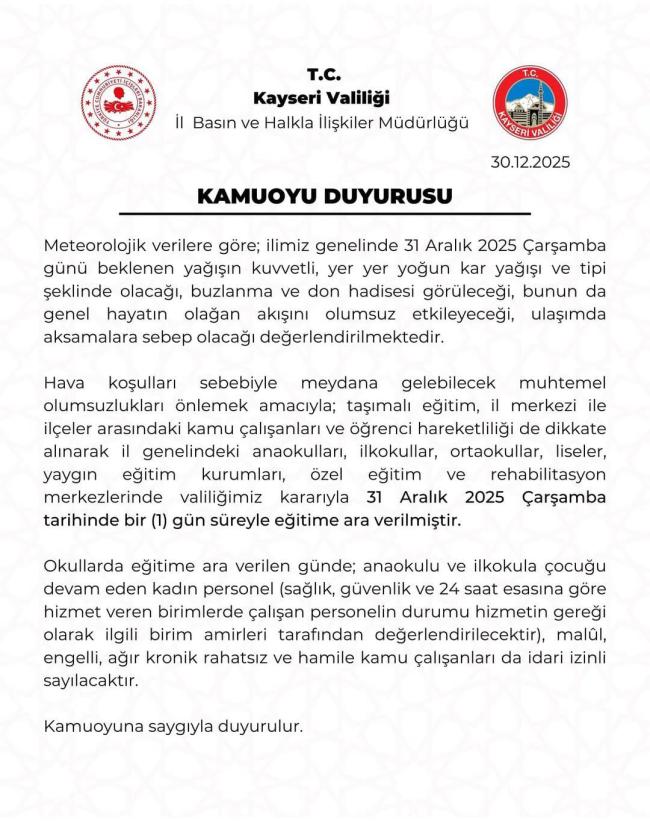 Kayseri’de etkisini artırması beklenen olumsuz hava koşulları nedeniyle eğitim öğretime geçici ara verildi. Meteorolojik değerlendirmeler doğrultusunda kent genelinde yoğun kar yağışı, tipi ve buzlanma riskinin artacağı öngörüldü.Bu kapsamda Kayseri Valiliği, 31 Aralık Çarşamba günü il genelindeki tüm anaokulu, ilkokul, ortaokul ve liseler ile yaygın eğitim kurumlarında eğitime 1 gün süreyle ara verildiğini duyurdu. Kararın, özellikle ulaşımda yaşanabilecek aksaklıklar ve öğrenci güvenliği göz önünde bulundurularak alındığı belirtildi.