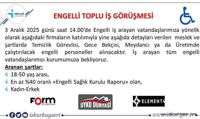 İŞKUR Kayseri, 3 Aralık’ta engelli vatandaşlar için toplu iş görüşmesi düzenleyecek. Temizlik, gece bekçisi, meydancı ve üretim pozisyonları var.