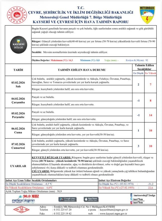 Meteoroloji 7. Bölge Müdürlüğü, Kayseri için önümüzdeki günleri kapsayan hava tahmin raporunu yayımladı. Rapora göre kent genelinde çok bulutlu hava, aralıklı yağışlar ve zaman zaman etkisini artıracak kuvvetli rüzgar bekleniyor. Tahminlere göre 3 Şubat Salı günü kentte sıcaklık 2 ila 7 derece arasında olacak. 4 Şubat Çarşamba günü parçalı ve az bulutlu bir hava öngörülürken, termometreler eksi 1 ile 8 dereceyi gösterecek. 5 Şubat Perşembe günü ise sıcaklıkların artarak eksi 1 ile 14 derece arasında seyretmesi bekleniyor. Haftanın sonuna doğru hava yeniden kapanıyor. 6 ve 7 Şubat tarihlerinde Kayseri genelinde çok bulutlu hava etkili olacak. Bu günlerde aralıklı yağmur, yüksek kesimler ve bazı ilçelerde ise yer yer karla karışık yağmur görülebileceği bildirildi. En yüksek sıcaklıkların 10 derece civarında kalacağı tahmin ediliyor.