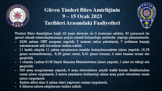Kayseri İl Emniyet Müdürlüğü Asayiş Şube Müdürlüğü’ne bağlı Güven Timi ekipleri, kentte huzuru sağlamak adına çalışmalarını sürdürüyor. Bu kapsamda ekiplerce 9-15 Ocak tarihleri arasında yapılan faaliyet raporu açıklandı. Güven Timleri Büro Amirliğine bağlı 22 yaya devriye ve 3 motorize ekibin, 97 personel ile genel olarak vatandaşların  yoğun olarak bulunduğu yerlerde yaptığı çalışmalarda; 2 bin 238 şahsın GBT (genel bilgi toplama sistemi) sorgusu yapıldı. 7 aranan kişi ve 7 yoklama kaçağı yakalanarak adli birimlere teslim edildi.