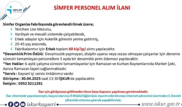 Türkiye İş Kurumu (İŞKUR), Kayseri'de faaliyet gösteren büyük bir fabrikanın yeni personel alımı yapacağını resmen açıkladı. Toplamda 60 erkek işçi istihdam edilecek. Başvuru şartlarından sunulan imkanlara kadar merak edilen tüm detaylar gün yüzüne çıktı.
