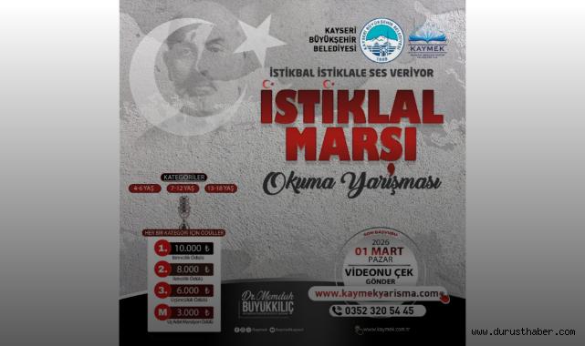 Kayseri Büyükşehir Belediyesi bünyesinde faaliyet gösteren KAYMEK, “İstikbal, İstiklâl’e Ses Veriyor” İstiklâl Marşı Okuma Yarışması düzenliyor. Yarışmaya başvurular 1 Mart 2026 Pazar günü saat 23.59’a kadar devam edecek.