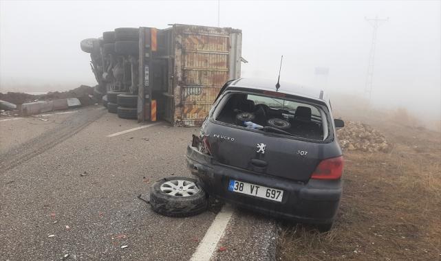Kayseri'nin Sarıoğlan ilçesinde kamyonun çarptığı otomobildeki 2 kişi yaralandı. Ş.K. yönetimindeki 38 RL 033 plakalı şeker pancarı yüklü kamyon, sis nedeniyle görüş mesafesinin azaldığı Kayseri Caddesi'nde, sürücü M.A'nın yol kenarında durdurduğu 38 VT 697 plakalı otomobile çarparak devrildi.İhbar üzerine kaza yerine polis ve sağlık ekibi sevk edildi.Sürücülerin yara almadığı kazada otomobilde bulunan Mehmet A. ve eşi Saadet A. yaralandı.Yaralılar, ambulansla Sarıoğlan Devlet Hastanesi'ne kaldırıldı.Öte yandan, kamyondaki şeker pancarlarının yola saçılması nedeniyle trafik bir süre aksadı.