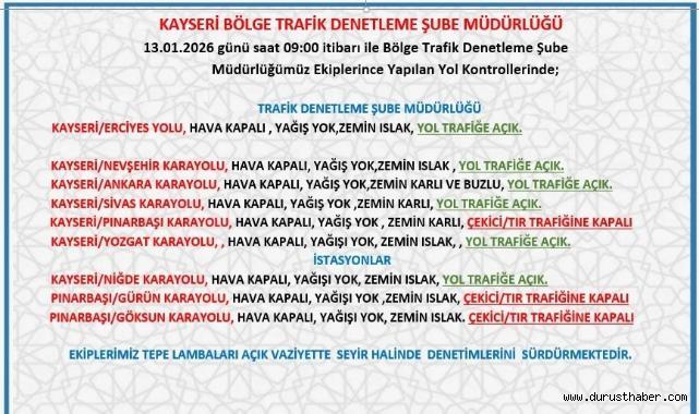 Kayseri İl Emniyet Müdürlüğü Bölge Trafik Denetleme Şube Müdürlüğü ekiplerince yol kontrolleri gerçekleştiriliyor. Bu kapsamda kontroller sonucunda merkez ve çevre ilçelerde bazı yolların açık bazı yolların ise çekici/tır trafiğine kapalı olduğu bildirildi. Emniyetin saat 09:00 itibariyle yapmış olduğu duyuruya göre;Kayseri/ Erciyes Yolu, Hava kapalı, yağış yok, zemin karlı, yol trafiğe açık.Kayseri/Nevşehir Karayolu, hava kapalı, yağış yok, zemin ıslak, yol trafiğe açık.Kayseri/Ankara Karayolu, Hava kapalı, yağış yok, zemin karlı ve buzlu, yol trafiğe açık.Kayseri/Sivas Karayolu, Hava kapalı, yağış yok, zemin karlı, yol trafiğe açık.Kayseri/ Pınarbaşı Karayolu, Hava kapalı, yağış yok, zemin karlı, çekici/tır trafiğine kapalı.Kayseri/Yozgat Karayolu, Hava kapalı, yağış yok, zemin ıslak, yol trafiğe açık.Kayseri/Niğde Karayolu, Hava kapalı, yağış yok, zemin ıslak, yol trafiğe açık.Pınarbaşı/Gürün Karayolu, Hava kapalı, yağış yok, zemin karlı, çekici/tır trafiğine kapalı.Pınarbaşı/Göksun Karayolu, Hava kapalı, yağış yok, zemin karlı, çekici/tır trafiğine kapalı.Buse Yıldız