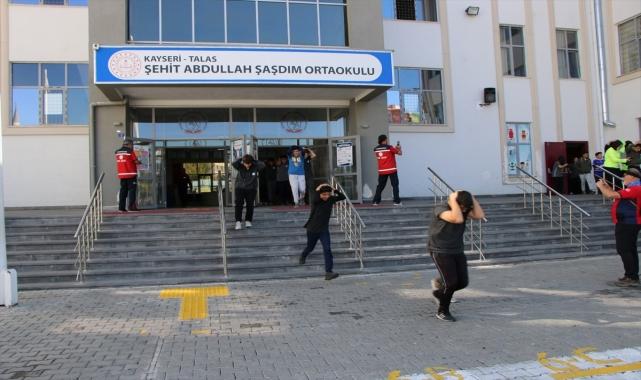 Kayseri'de Dünya Afet Riskinin Azaltılması Günü dolayısıyla bir okulda yangın tatbikatı yapıldı. İl Milli Eğitim Müdürlüğünden yapılan açıklamaya göre, Talas ilçesi Şehit Abdullah Şaşdım Ortaokulu'nda AFAD ve Büyükşehir Belediyesi İtfaiye Daire Başkanlığının düzenlediği tatbikatta, alarmın çalmasıyla öğrenciler, ekiplerin kontrolünde sınıfları tahliye ederek okul bahçesinde toplandı.İtfaiye ekipleri, senaryo gereği okulda mahsur kalan öğrencileri araç merdiveni ile kurtardı. Dumandan etkilenen öğrenciler ise sağlık ekiplerinin müdahalesinin ardından ambulansla hastaneye kaldırıldı.İtfaiye personeli, okul bahçesinde toplanan öğrencilere, yangına müdahalenin nasıl yapılacağını uygulamalı gösterdi.Jandarma Arama Kurtarma ekiplerinin eğitimli köpeği de gösteri sundu.Tatbikata Vali Yardımcısı Adnan Türkdamar, Talas Kaymakamı Yaşar Dönmez, İl Milli Eğitim Müdürü Bahameddin Karaköse, Büyükşehir Belediyesi İtfaiye Daire Başkanı Mustafa Metin Kızılkan ve AFAD İl Müdürü Osman Atsız katıldı.