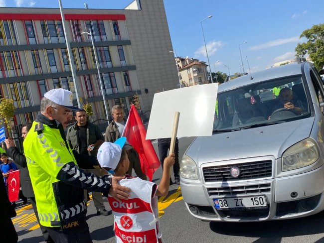 Uygulama eğitiminde Kayseri Vali Yardımcısı ve protokol üyeleri çocuklarla birlikte yaya geçidini kullanarak yolun karşısına geçerken ellerinde Türk bayrakları ve uyarıların yazılı olduğu dövizler taşıyan minik öğrenciler de ’Öncelik yayanın’ uyarısında bulundu. Etkinlikte farkındalık oluşturmak için Kayseri Vali Yardımcısı Şenol Esmer ve öğrenciler yaya geçidinde kırmızı olan bölümü yeniden boyadı. Okul önündeki etkinliğin ardından trafik ekipleri okulda öğrencileri bilgilendirdi.