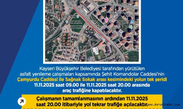 Kayseri Büyükşehir Belediyesi, asfalt yenileme çalışmaları nedeniyle Şehit Komandolar Caddesi’nin bir bölümü 11 Kasım Salı günü 09.00-20.00 saatleri arasında kapalı olacak.