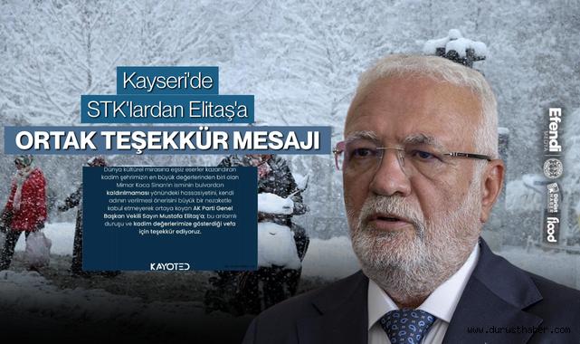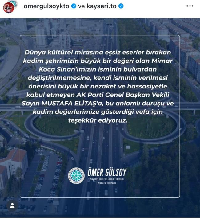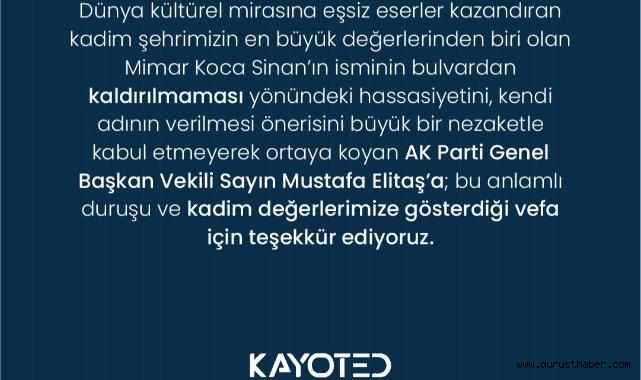 STK’ların ortak açıklamasında, “Dünya kültürel mirasına eşsiz eserler bırakan kadim şehrimizin büyük bir değeri olan Mimar Koca Sinan’ımızın isminin bulvardan değiştirilmemesine, kendi isminin verilmesi önerisini büyük bir nezaket ve hassasiyetle kabul etmeyen AK Parti Genel Başkan Vekili Sayın Mustafa Elitaş’a; bu anlamlı duruşu ve kadim değerlerimize gösterdiği vefa için teşekkür ediyoruz” ifadelerine yer verildi.