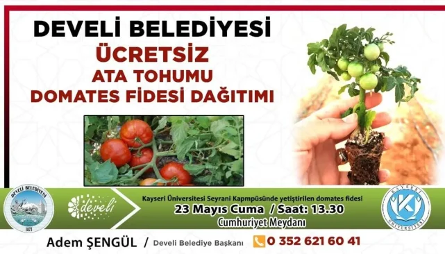 Belediyeden yapılan açıklamaya göre, 23 Mayıs Cuma günü saat 13.30’da Develi Cumhuriyet Meydanı’nda ücretsiz domates fidesi dağıtımı yapılacak. Vatandaşlara sunulacak fideler, Kayseri Üniversitesi Seyrani Kampüsü’nde yetiştirilen yerli ata tohumu domates fideleri olacak.