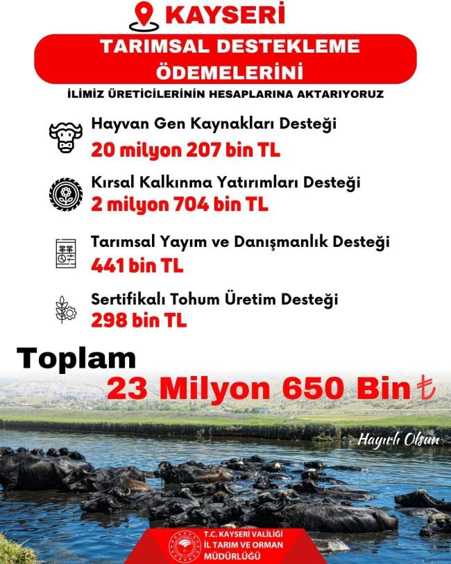 Tarım ve Orman Bakanlığı, Kayseri’deki üreticilere toplam 23 milyon 650 bin TL tutarında tarımsal destek ödemesinin hesaplara aktarılacağını duyurdu.