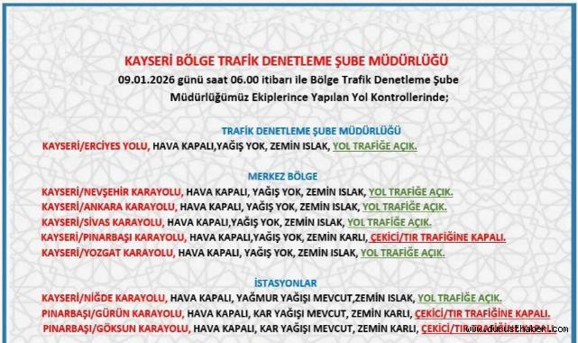 Kayseri İl Emniyet Müdürlüğü Bölge Trafik Denetleme Şube Müdürlüğü ekiplerince yapılan yol kontrolleri sonucunda merkez ve çevre ilçelerdeki yol durumu kamuoyu ile paylaşıldı. Saat 06.00 itibarıyla yapılan açıklamada, kar ve yağış nedeniyle bazı güzergâhlarda tedbirlerin artırıldığı bildirildi.