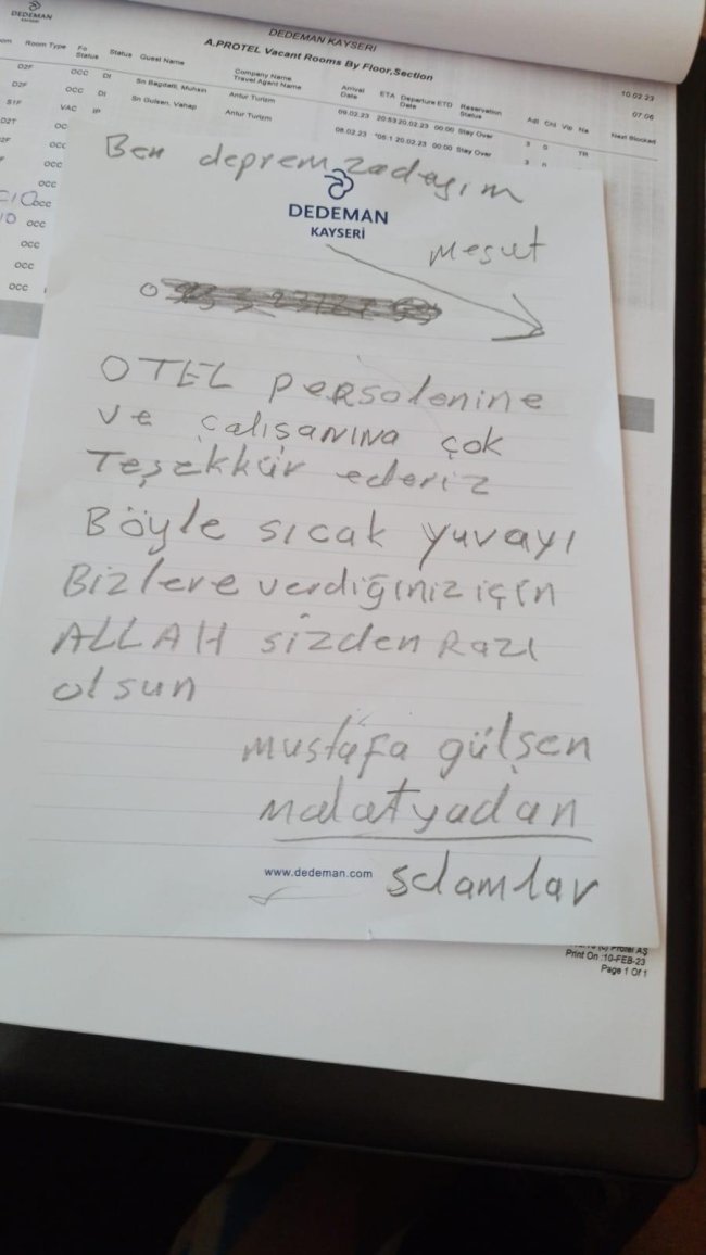 Otelde kalan depremzedeler ise yardımları için otele ve personellere teşekkür etti. Depremzede Mustafa Gülşen, otele bıraktığı notla otel çalışanlarına teşekkür ederek, “Otel personeline ve çalışanına çok teşekkür ederiz. Böyle sıcak bir yuvayı bizlere verdiğiniz için Allah sizden razı olsun” dedi.