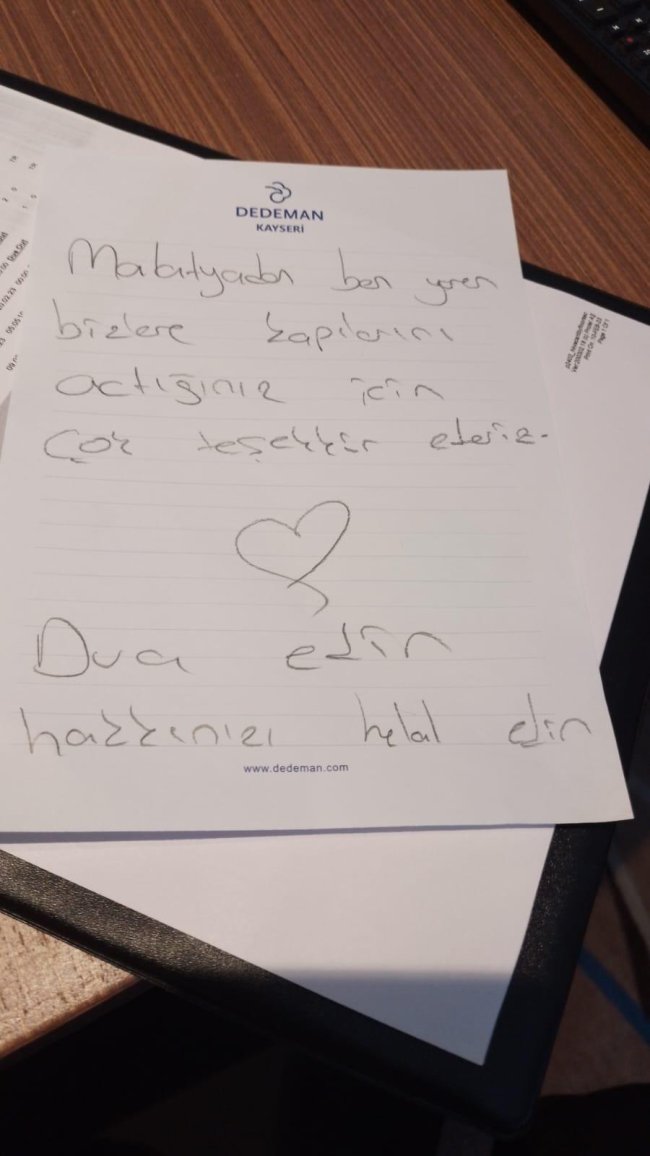 Malatya’dan gelen Yaren isimli depremzedenin ise otele bıraktığı notta şu ifadeler yer aldı: “Ben Malatya’dan Yaren. Bizlere kapılarını açtığınız için çok teşekkür ederiz. Dua edin, hakkınızı helal edin.“