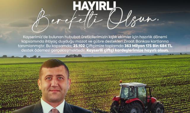 MHP Milletvekili Baki Ersoy, Kayseri’de bulunan hububat üreticilerinin kışlık ekim için hazırlık dönemi kapsamında mazot ve gübre desteğinin hesaplarına yatırıldığını duyurdu. Vekil Ersoy, 25 bin çiftçiye 363 milyon 175 bin 684 liralık destek ödemesiyle ilgili, “Kayseri'mizde bulunan hububat üreticilerimizin kışlık ekim için hazırlık dönemi kapsamında ihtiyaç duyduğu mazot ve gübre destekleri Ziraat Bankası kartlarına tanımlanmıştır. Bu kapsamda, 25 bin 102 çiftçimize toplamda 363 milyon 175 bin 684 lira destek ödemesi gerçekleştirildi” dedi.