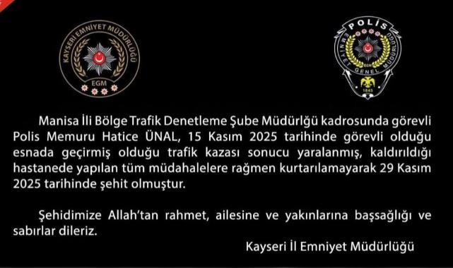 Kayseri İl Emniyet Müdürlüğü, Manisa İl Bölge Trafik Denetleme Şube Müdürlüğü kadrosunda görevli polis memuru Hatice Üanl’ın 15 Kasım 2025 tarihinde görev esnasında geçirdiği trafik kazasında yaralandığını bildirdi. Hastanede yapılan tüm müdahalelere rağmen Üanl, 29 Kasım 2025 tarihinde şehit oldu.Kayseri İl Emniyet Müdürlüğü, şehidimize Allah’tan rahmet, ailesine ve yakınlarına başsağlığı ve sabır diledi. Kamuoyuna duyurulan açıklamada, “Vatanımız için görev başında hayatını kaybeden şehidimizi rahmetle anıyoruz” ifadelerine yer verildi.