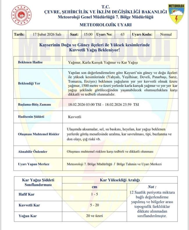 Meteroloji 7. Bölge Müdürlüğü , Kayseri ve çevresi için kuvvetli yağış uyarısında bulundu. Yapılan değerlendirmelere göre kent genelinde karla karışık yağmur beklenirken, özellikle yüksek kesimlerde kar yağışı etkili olacak.