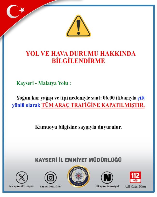 Kayseri İl Emniyet Müdürlüğü Trafik Denetleme Şube Müdürlüğü tarafından yapılan bilgilendirmede, olumsuz hava koşulları sebebiyle yolun saat 06.00 itibarıyla çift yönlü olarak tüm araç trafiğine kapatıldığı duyuruldu.