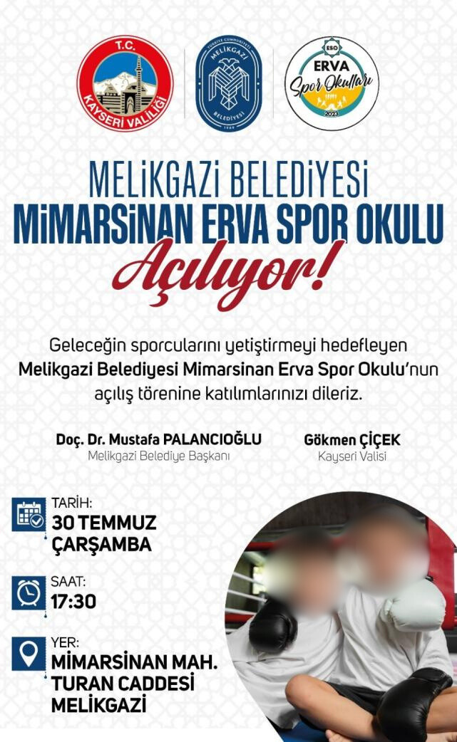 Kayseri’de gençleri spora teşvik etmek amacıyla Melikgazi Belediyesi tarafından hayata geçirilen Mimarsinan ERVA Spor Okulu, 30 Temmuz Çarşamba günü düzenlenecek törenle kapılarını açıyor.