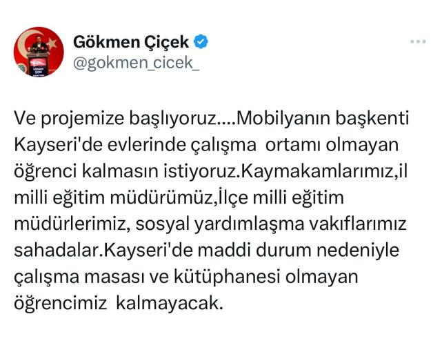 Kayseri Valisi Gökmen Çiçek, maddi durumu nedeniyle çalışma masası ve kütüphanesi olmayan öğrenciler için çalışma başlatılıp destek verileceğini dün sosyal medya hesabından paylaşım yaparak duyurmuştu. Vali Çiçek’in hesabından yapılan paylaşımda “Ve projemize başlıyoruz. Mobilyanın başkenti Kayseri'de evlerinde çalışma ortamı olmayan öğrenci kalmasın istiyoruz. Kaymakamlarımız, il milli eğitim müdürümüz, İlçe milli eğitim müdürlerimiz, sosyal yardımlaşma vakıflarımız sahadalar. Kayseri'de maddi durum nedeniyle çalışma masası ve kütüphanesi olmayan öğrencimiz kalmayacak” ifadelerine yer vermişti.