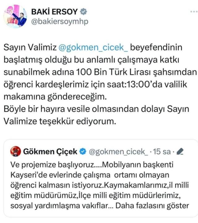 Kayseri Valisi Gökmen Çiçek, çalışma ortamı olmayan öğrenciler için proje kapsamında dün çalışma başlatıldığını sosyal medya hesabından duyurmuştu. Bu çalışmaya katkı sağlamak isteyen Milliyetçi Hareket Partisi Kayseri Milletvekili Baki Ersoy öğrenciler için 100 bin lira eğitim desteğinde bulunacağını açıkladı.