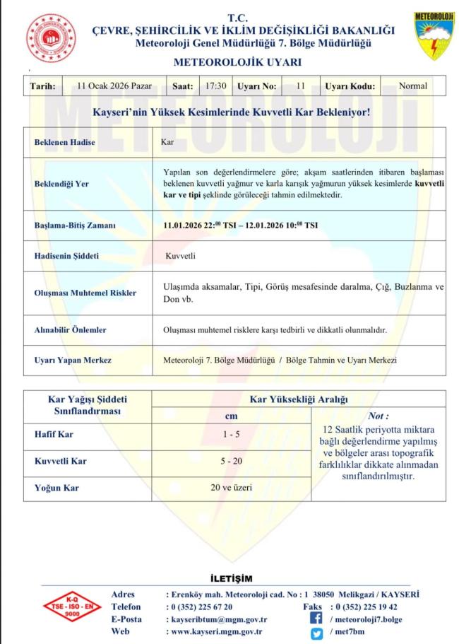 Meteoroloji Genel Müdürlüğü 7. Bölge Müdürlüğü, Kayseri’nin yüksek kesimleri için kuvvetli kar yağışı uyarısı yaptı. Yapılan değerlendirmelere göre, akşam saatlerinden itibaren etkisini artırması beklenen yağışların, yüksek rakımlı bölgelerde karla karışık yağmur ve yer yer kuvvetli kar ile tipi şeklinde görüleceği tahmin ediliyor.