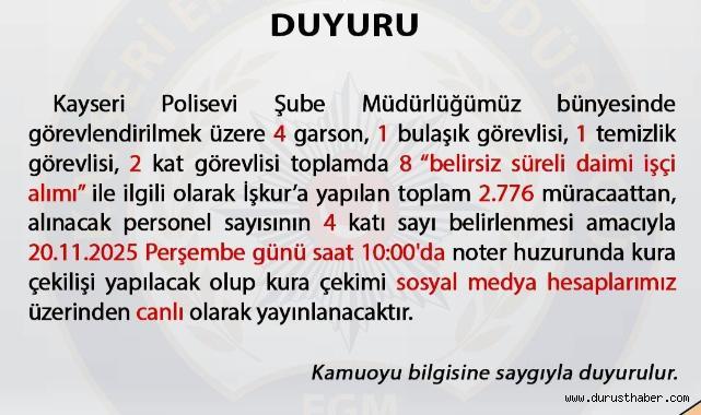 Kayseri Polisevi Şube Müdürlüğü, bünyesinde görevlendirilmek üzere toplam 8 “belirsiz süreli daimi işçi” alımı gerçekleştireceğini duyurdu. İlan edilen pozisyonlar arasında 4 garson, 1 bulaşık görevlisi, 1 temizlik görevlisi ve 2 kat görevlisi bulunuyor.