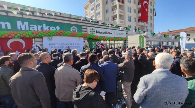 1 Haziran 2021’de temeli atılan ve 3 bin 398 metrekare alan üzerine inşa edilen ve iki bloktan oluşan tesiste, bölge müdürlüğü hizmet binası ve tarım marketin yanı sıra, 150 metrekarelik 24 adet daire ve 10 adet de dükkânın yer aldığı kompleks törenle hizmete açıldı.Bünyanlı çiftçilerin yanı sıra siyasi parti ve sivil toplum kuruluş temsilcilerinin de yoğun ilgi gösterdiği törene Bünyan Belediye Başkanı Özkan Altun ve ilçe protokolü de katıldı.Törende konuşan Bünyan Ziraat Odası Başkanı Lütfi Özsolak, bu tesislerin inşa edildiği arsanın Ziraat Odası’na ait olduğu ve Kayseri Şeker ile yapılan anlaşma çerçevesinde bu yatırımın gerçekleştirildiğini söyledi. Başkan Özsolak;‘Kayseri Şeker sayesinde odamızın atıl vaziyette duran arsası değerlendirilmekle kalmayıp 10 adet dükkânda Ziraat Odamıza arsa karşılığı kazandırılmış oldu. İlçemize değer katan böylesi bir yatırımı gerçekleştiren başta Kayseri Pancar Ekicileri Kooperatifi Başkanımız Hüseyin Akay olmak üzere Belediye Başkanımıza ve emeği geçen herkese teşekkür ediyorum. Çiftçilerimize ve Bünyan’ımıza hayırlı olsun’ dedi.Belediye Başkanı Özkan Altun da, Bünyan’a böylesi bir yatırımın yapılmasının son derece sevindirici olduğunu ifade ettiği konuşmasında şu görüşlere yer verdi:‘Tarım Market ve içerisinde idari hizmet binası, yeni konutlar ve iş yerlerinin bulunduğu bu değerli yapı ilçemizdeki gelişim ve değişime katkı sağlayarak Kayseri Şeker’in ve Yönetim Kurulu Başkanımız Hüseyin Akay’ın bize vermiş olduğu kıymeti gösteren bir değerdir. Bizde Bünyan Belediyesi olarak her türlü desteği verdik, vermeye devam edeceğiz. Bünyan’a vermiş olduğunuz değerden dolayı Hüseyin Akay Başkanın öncülüğünde tüm Kayseri Şeker ailesine teşekkür ediyorum. Hayırlı uğurlu olsun diyorum’Kayseri Pancar Ekicileri Kooperatifi Yönetim Kurulu Başkanı Hüseyin Akay da konuşmasında şu görüşlere yer verdi:“Mutlu bir vesile ile bir aradayız, gurur duyuyorum. Yatırımlar hep beraber gerçekleşiyor, başarı birlikte sağlanabiliyor, kolay da olmuyor ama Bünyan’a değer katan bir tesisi kazandırmış olmak hepimiz için gurur vesilesi bu başarıda Kayseri Şeker Fabrikasının ve Kayser Pancar Kooperatifinin Yönetiminde görev alan bütün arkadaşlarımızın da etkileri, katkıları var onlara hasletten teşekkür ediyorum.Dünya’da ekonomik krizin, sorunların devam ettiği ortamda Kayseri Şeker hem işini en iyi yapıyor hem de bu yatırımları yapacak gücü kendisinde buluyor. Allah’a şükür bu gücü bize öncelikle çiftçilerimiz veriyor. Allah razı olsun bunları başarma gücü versin. Allah emeğinizi zayi etmesin. İnşallah bu tesis bu bölgedeki bütün çiftçilerimize iyi hizmetler sunacak, katkı sağlayacak, ihtiyaçlarını en iyi seviye de karşılayacak Allah hayırlı, uğurlu eylesin.” diyerek katılımlarından dolayı davetlilere teşekkürlerini iletti.Kayseri Şeker Bünyan Pancar Bölge Müdürlüğü ve Tarım Marketin açılış töreni Bünyan Müftüsü Çelebi Gün’ün dua konuşması ve kurban kesimi ile sona erdi.